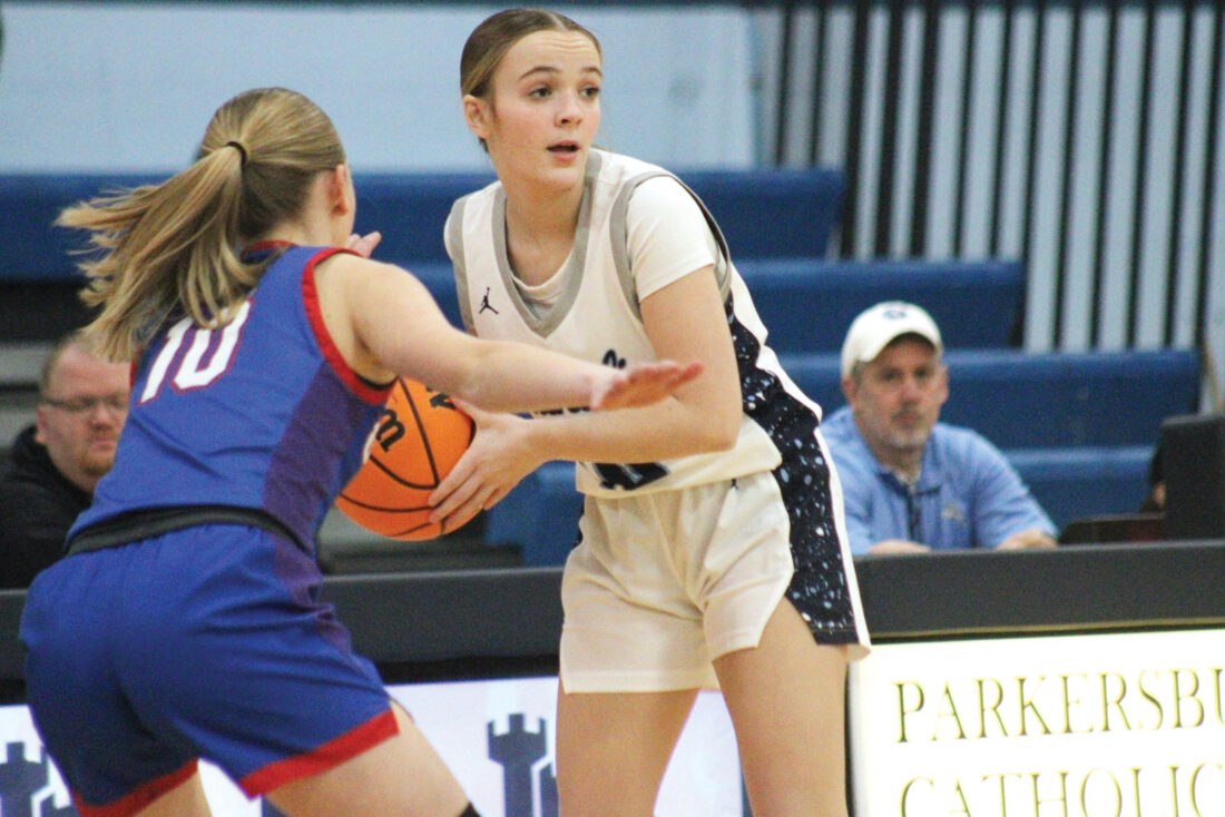 - Parkersburg Catholic’s Caroline Wynn looks over the offense, right, while being guarded by Gilmer County’s Erin Stoddard. (Photo by Kerry Patrick)