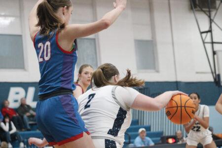 - Gilmer County’s Ava Dobbins (20) defends Parkersburg Catholic’s Bryley Starker (2) during Thursday’s game in Parkersburg. (Photo by Kerry Patrick)