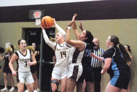 - Williamstown’s Arissa Burt pulls back as teammate Maggie Frye (14) grabs a rebound during the Yellowjackets’ 51-39 Little Kanawha Conference victory versus Parkersburg Catholic on Tuesday evening. (Photo by Jay W. Bennett)
