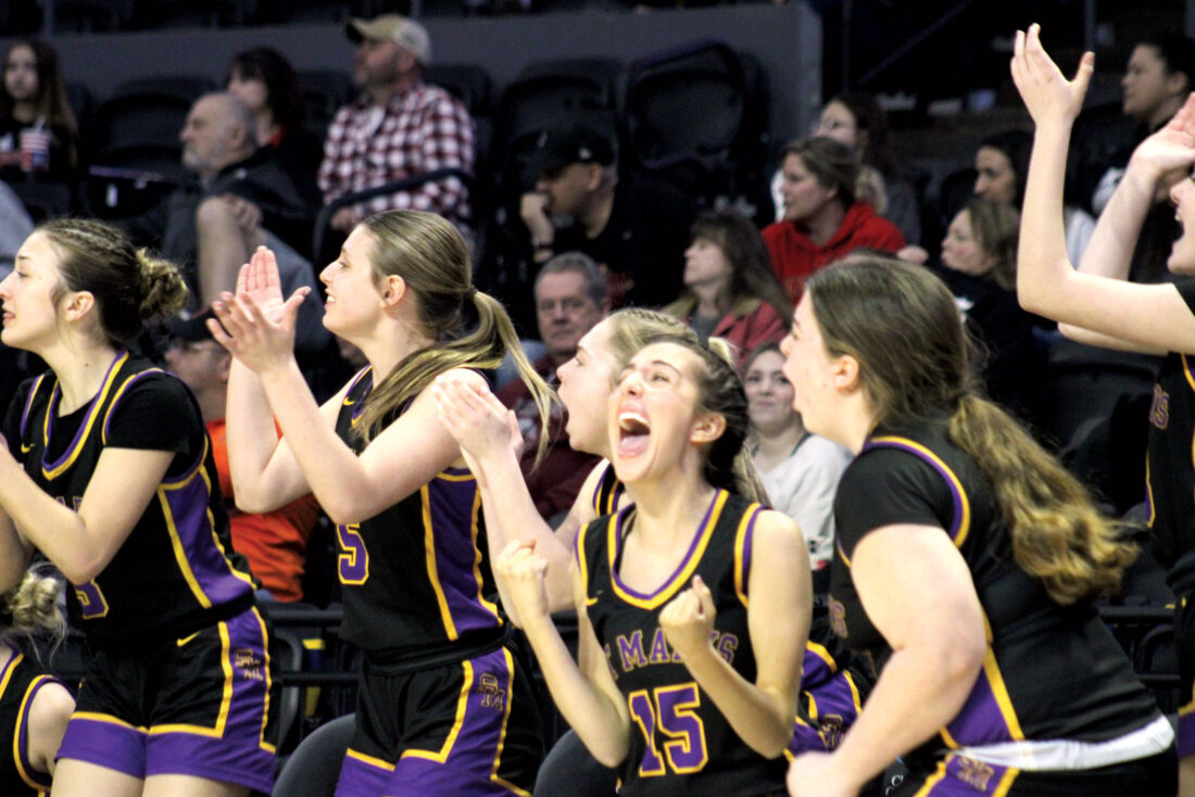 The St. Marys bench erupts in celebration after the Blue Devils defeated Tug Valley, 52-50, in the Class A semifinals during Thursday’s West Virginia High School Girls State Basketball Tournament in Charleston. (Photo by Kerry Patrick)