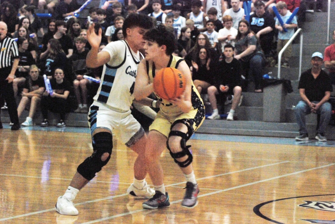 - Parkersburg Catholic’s Leonardo DeAngelo pressures Magnolia point guard Scott Bailey during the Crusaders’ 47-32 Class A, Region I, co-final victory Wednesday night. (Photo by Jay W. Bennett)