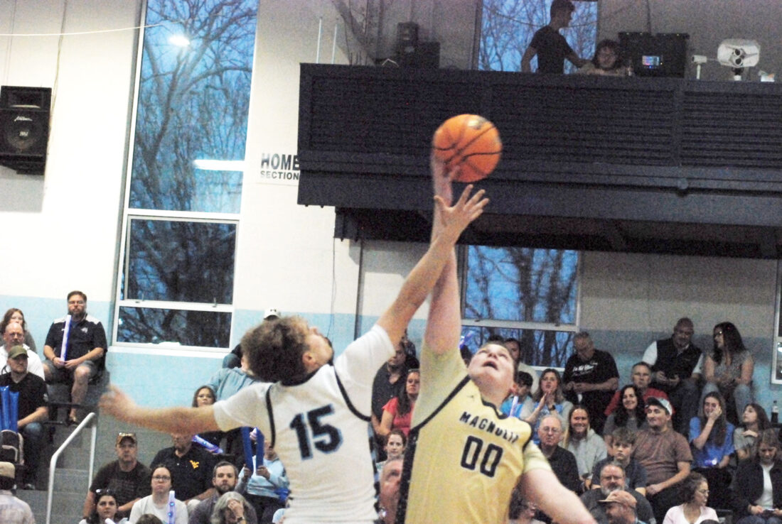 - Parkersburg Catholic’s Luke Anderson and Magnolia’s Noah Hood battle for the jump ball during the Crusaders’ 47-32 Class A, Region I, co-final victory Wednesday night. (Photo by Jay W. Bennett)