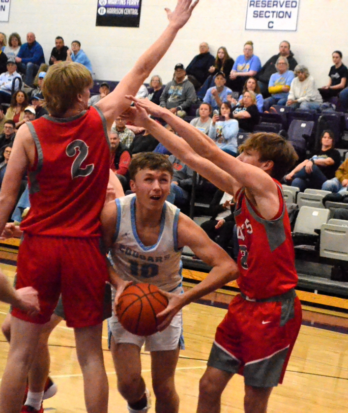 - Frontier’s Jacob Bowersock, center, attacks the basket during Tuesday’s district semifinal game against River at Martins Ferry. (Photo by Mike Morrison)