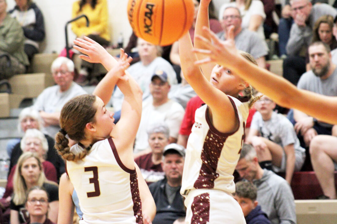 Williamstown’s Quinn Bunch (3) and teammate Makaela Bandy watch a ball sail between them during Thursday’s Class AA, Region I Semifinal against Oak Glen at Williamstown High School. (Photo by Kerry Patrick)