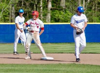 - Fort Frye’s Grady Shuster celebrates with the dugout following a double during the Cadets’ 8-3 win Thursday at Warren. (Photo by Jay W. Bennett)