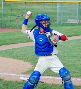 - Fort Frye catcher Wyatt Duskey makes a throw to first following a strikeout on a wild pitch during the Cadets’ 8-3 win Thursday at Warren. (Photo by Jay W. Bennett)