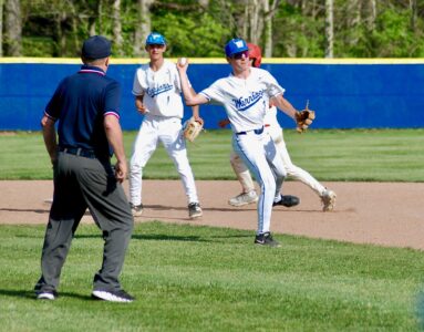- Fort Frye second baseman Carter Brown makes a throw to first during the Cadets’ 8-3 win Thursday at Warren. (Photo by Jay W. Bennett)