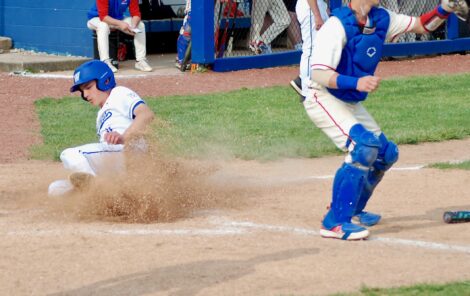 - Warren’s Tate Jonas slides safely into home during the Warriors’ 8-3 setback Thursday to Fort Frye. (Photo by Jay W. Bennett)