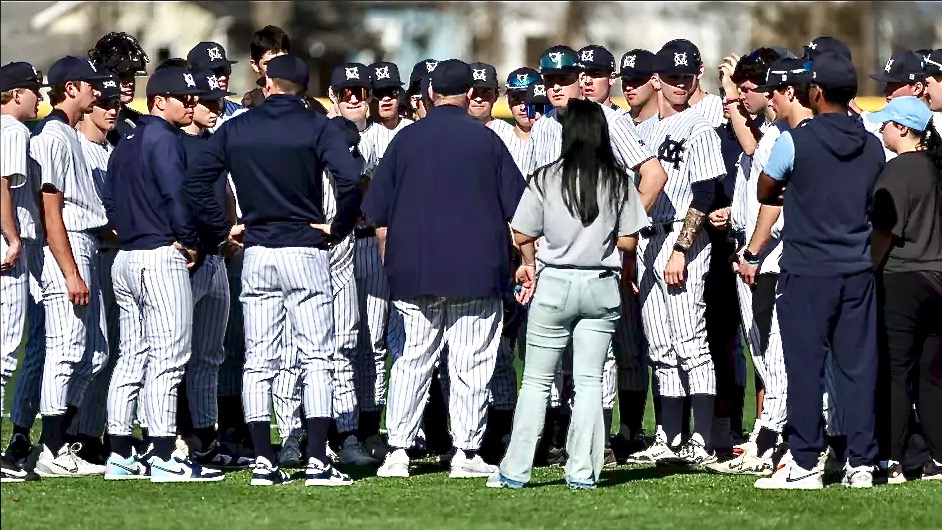 The Marietta College baseball team huddles up between games against Mount Union Wednesday at Pioneer Park. (Photo by Rebecca Wheeler Photography)