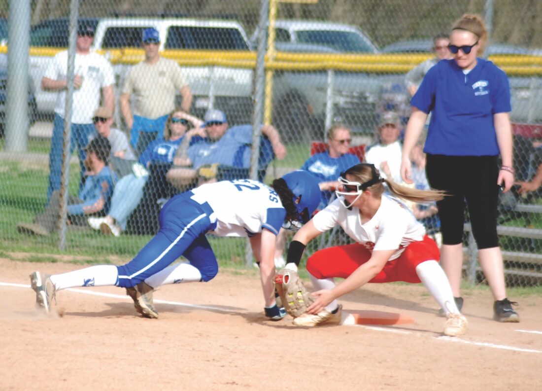 - Parkersburg’s Kendall Kimes slides safely into third base in front of Warren’s Hailey Metz for a triple during the Big Reds’ 8-6 setback on Tuesday evening at Larry Allen Field. (Photo by Jay W. Bennett)