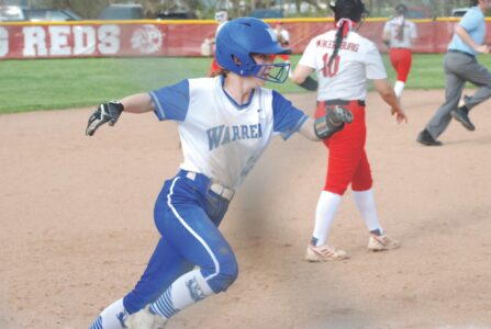 - Warren courtesy runner Jeanna Klinglesmith rounds third and heads for home during the Warriors’ 8-6 victory versus host Parkersburg on Tuesday evening at Larry Allen Field. (Photo by Jay W. Bennett)