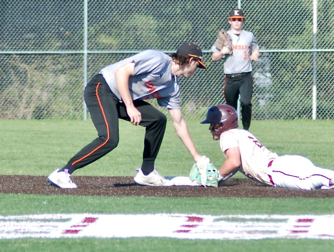 - Williamstown first baseman Tyler Keiser gets brushed back during Thursday’s game versus Linsly. (Photo by Jay W. Bennett)