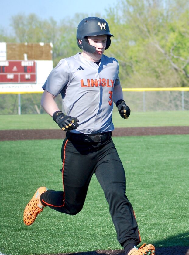 - Linsly center fielder Chris Upton, pictured here scoring the Cadets’ first run against Williamstown, finished a double shy of the cycle after going 4-for-4 with a triple, a two-run homer and four runs-batted-in. (Photo by Jay W. Bennett)