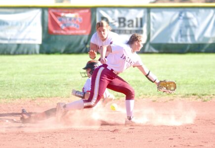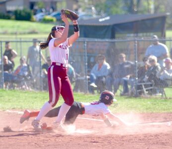 - The ball gets past Williamstown shortstop Gracie Rush as Marietta’s Samantha Mayo successfully steals second base during Saturday’s game at Phillips Field. (Photo by Jordan Holland)