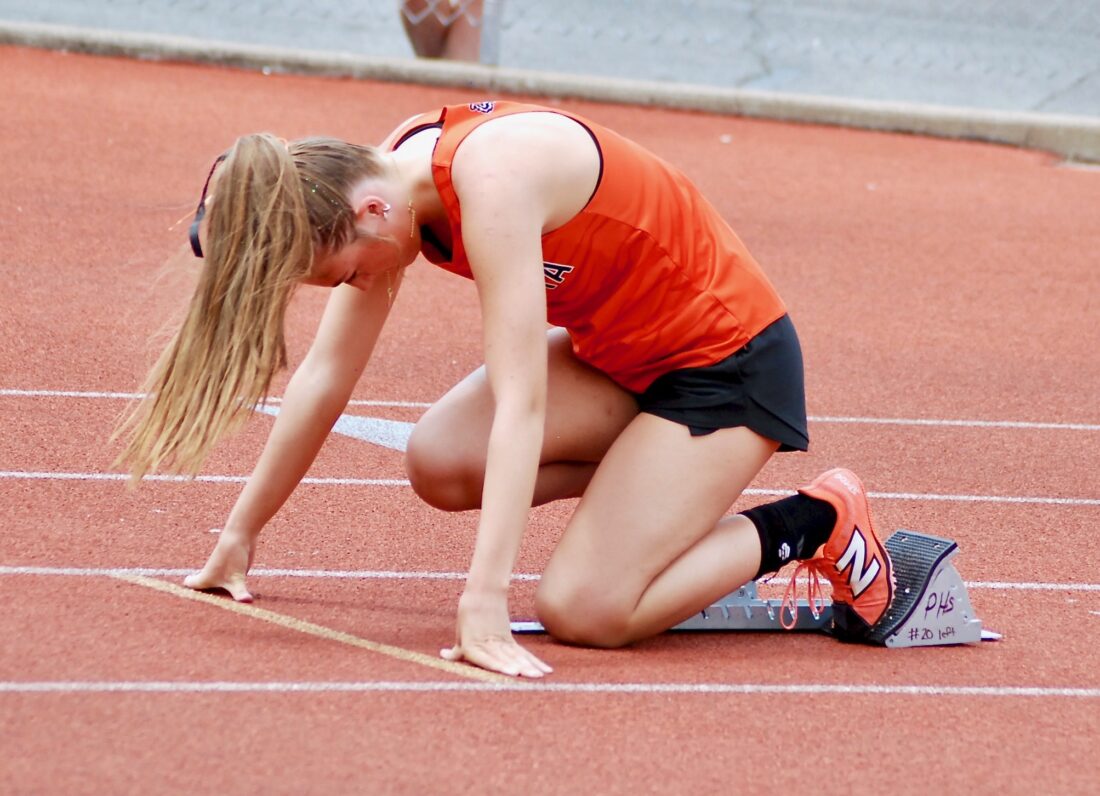 - Marietta’s Kipplyn McNeal takes her mark prior to the gun in the 400 during Saturday’s Russ Parsons Invitational at Parkersburg High School. (Photo by Jay W. Bennett)