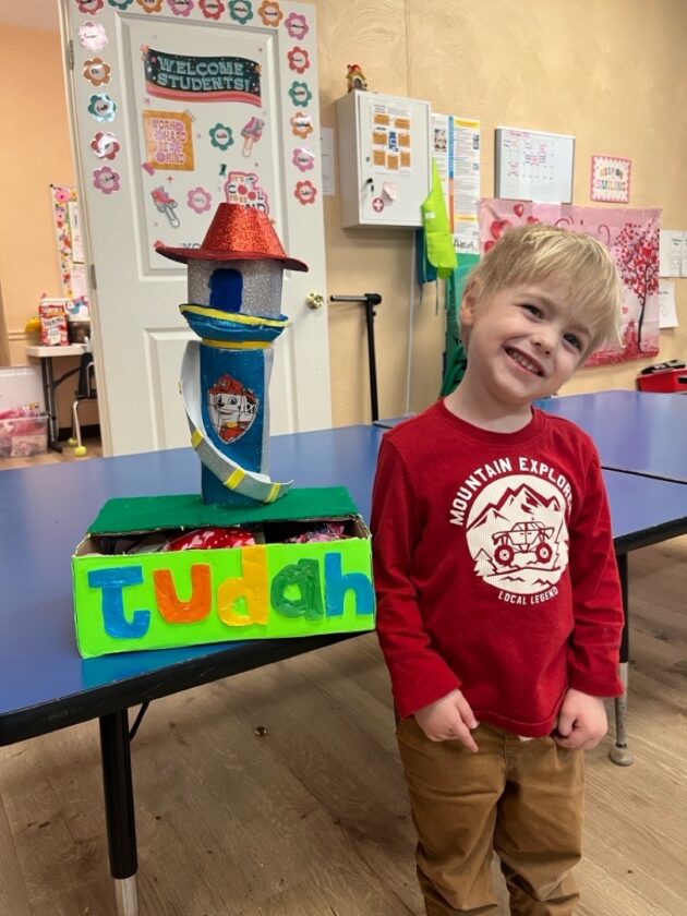 Photo provided Judah poses in front of his Valentine’s Day box created by Jackson Middle School seventh-graders for Olivia and Friends Childhood and Development Center.