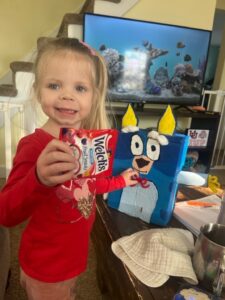 - Photo provided Fiadh holds up a pack of fruit snacks she received in her Bluey inspired Valentine’s Day box created by Jackson Middle School seventh-graders for Olivia and Friends Childhood and Development Center.
