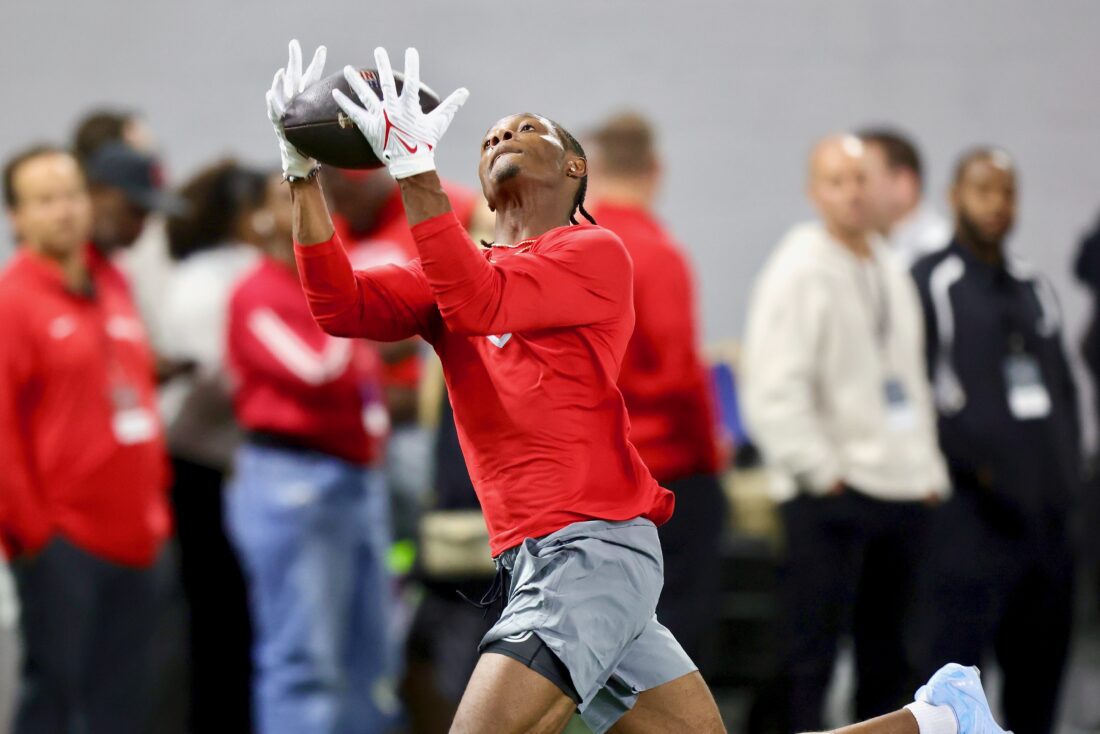 Ohio State wide receiver Carnell Tate makes a catch during the school's NFL pro day in Columbus, Ohio. (AP Photo/Paul Vernon)