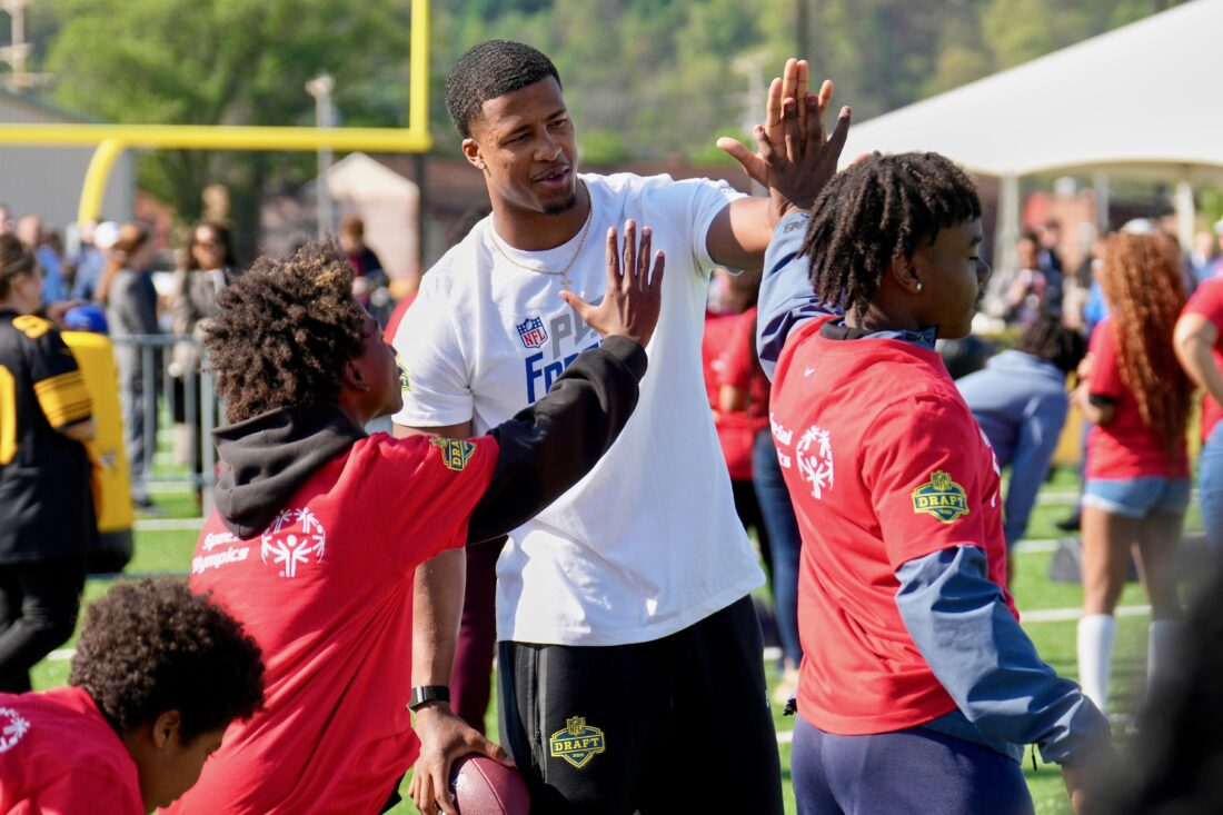 Sonny Styles, Ohio State linebacker, works with local youth football players and Special Olympics athletes during the league's annual prospect clinic ahead of the NFL draft Wednesday in Pittsburgh. (AP Photo/Sue Ogrocki)