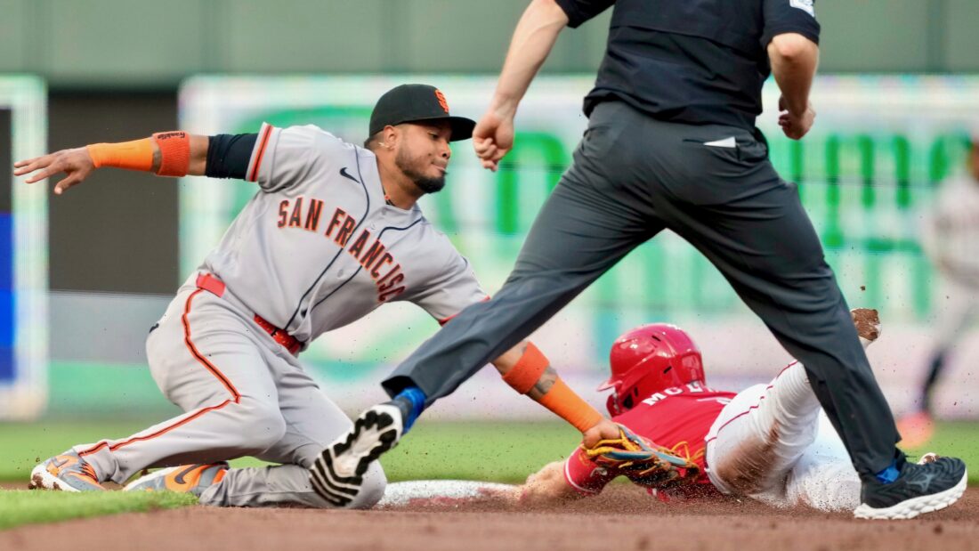 Cincinnati Reds' Matt McLain, right, is caught stealing second base by San Francisco Giants shortstop Willy Adames, left, as umpire Junior Valentine moves in during the first inning of a baseball game Tuesday in Cincinnati. (AP Photo/Carolyn Kaster)