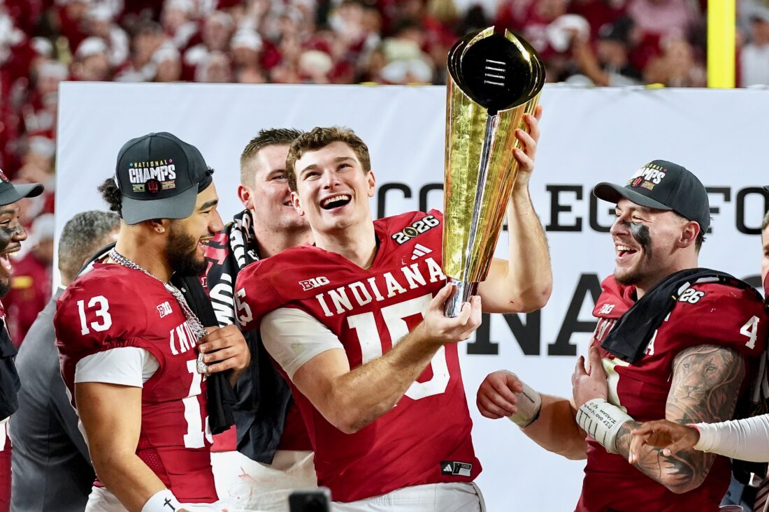 Indiana quarterback Fernando Mendoza holds the trophy after Indiana defeated Miami in a College Football Playoff national championship game in Miami Gardens, Fla. (AP Photo/Lynne Sladky, File)
