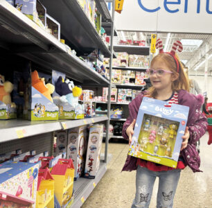 (Photo By Michelle Dillon) Parkersburg resident Eden Wyer, 5, shows off a Bluey toy she chose as part of the Washington County Sheriff’s Shop With A Cop event Saturday.