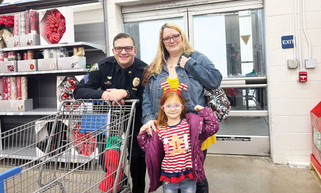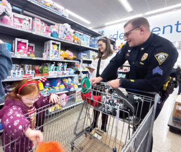 (Photo By Michelle Dillon) Vienna Police Sgt. Fred Cochran, right, and his wife Sierra Cochran, center, watch Eden Dwyer, 5, left, place a toy in a cart during the Vienna Police’s Shop With A Cop Event at the Vienna Walmart Saturday.