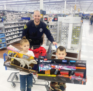 - (Photo Provided) Marietta Police Patrolman Tip Griffin poses with two children with which he participated in Shop With A Cop Saturday morning at the Marietta Walmart. Each child received $250 to spend on toys of their choosing.