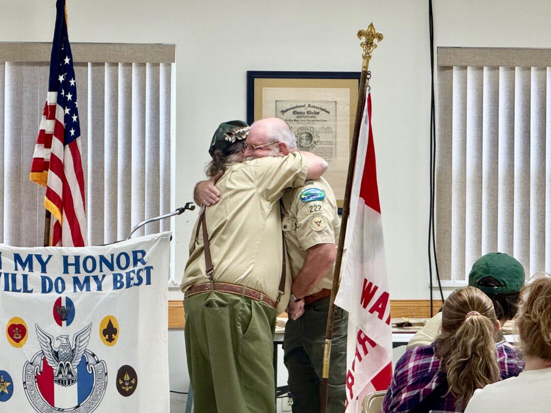 (Photo by Amber Phipps) Daryl Van Dyne hugs his friend Robert Dat during his 50th anniversary as Scoutmaster celebration on Saturday.