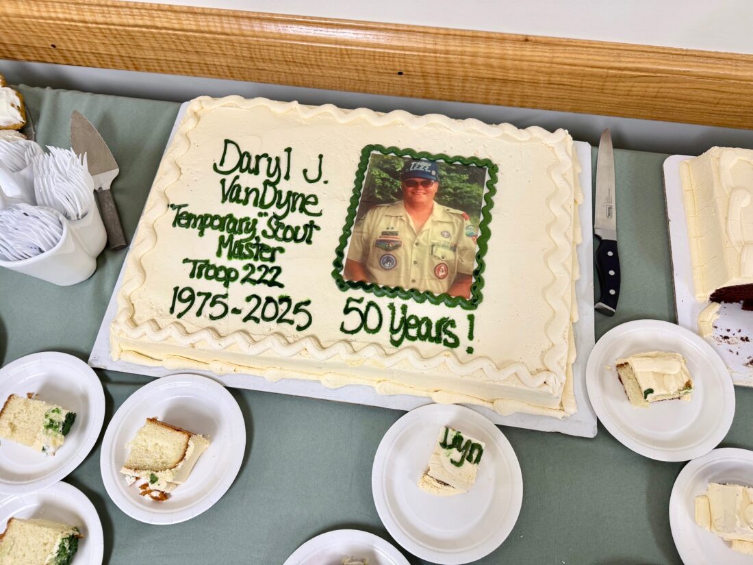 - (Photo by Amber Phipps) The cake at Daryl Van Dyne’s 50th anniversary as Scoutmaster for Waterford Boy Scout Troop 222. He celebrated with family and friends on Saturday.