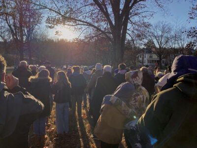 The crowd gathered to watch the winter solstice sunset Sunday in Marietta moved up on the top of the Turtle Mound to watch the sunset a second time from a higher vantage point after initially watching it in Sacra Via Park. (Photo by Brett Dunlap)