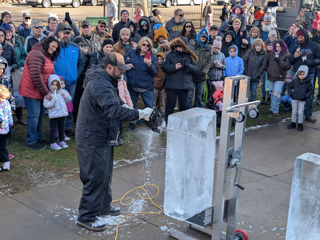 Photo by Evan Bevins Tyson Whistler of Whistler Ice Works carves a large block of ice during an ice-sculpting demonstration Saturday afternoon on the front lawn of the Armory as part of the 10th annual Glenwood Community Marietta Ice Festival.