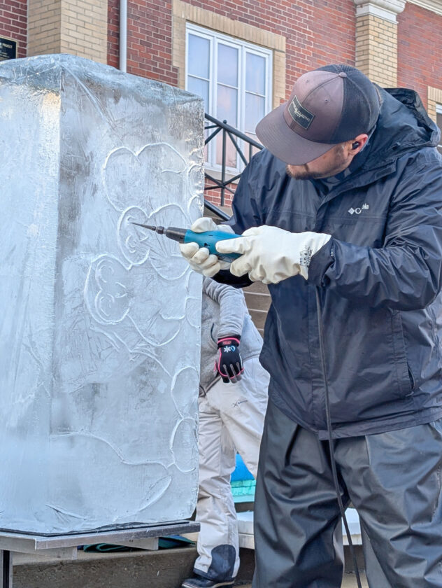 Photo by Evan Bevins Tyson Whistler of Whistler Ice Works carves a design during an ice-sculpting demonstration Saturday afternoon on the front lawn of the Armory as part of the 10th annual Glenwood Community Marietta Ice Festival.