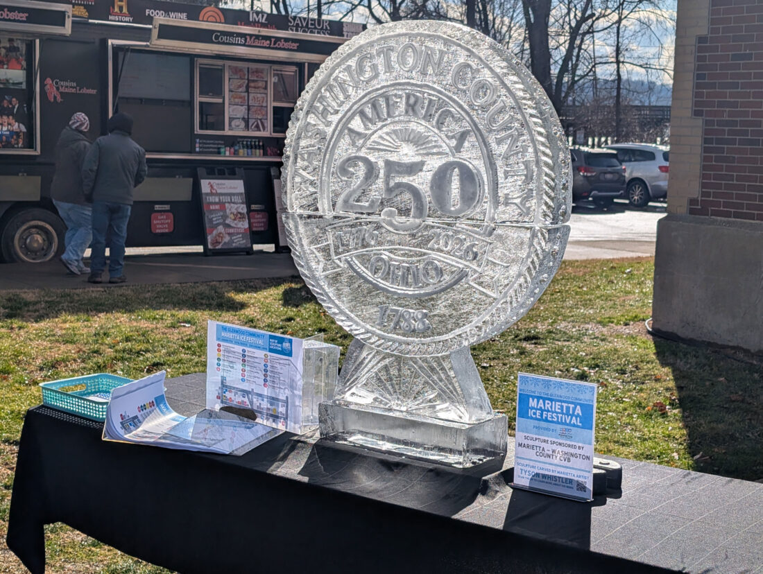 - Photo by Evan Bevins The Marietta-Washington County Convention and Visitors Bureau commissioned this ice sculpture commemorating local participation in this year’s celebration of the 250th anniversary of the signing of the Declaration of Independence.