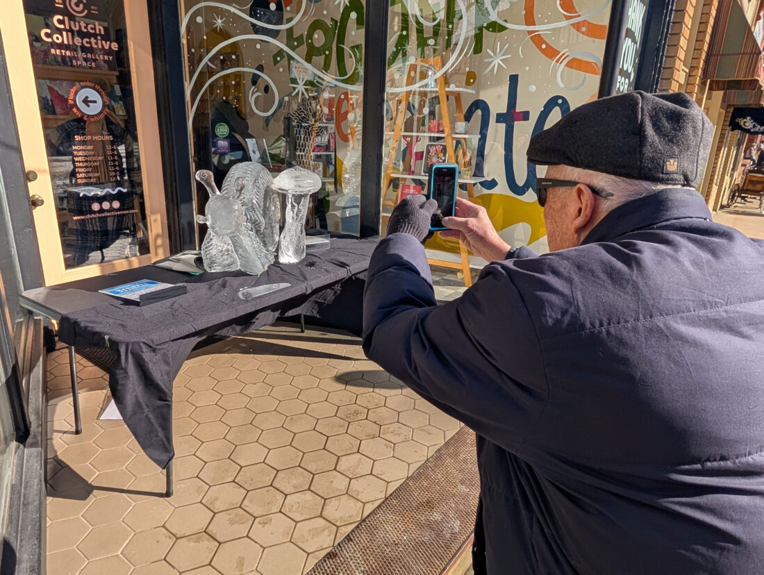 Photo by Evan Bevins Marietta resident John Lee takes a picture of an ice sculpture of a snail and mushroom in front of Clutch Collective on Front Street Saturday during the Marietta Ice Festival.