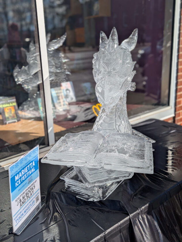 - Photo by Evan Bevins A bust of a dragon reading a book was the ice sculpture in front of J and M Books and Play on Front Street Saturday during the annual Marietta Ice Festival.