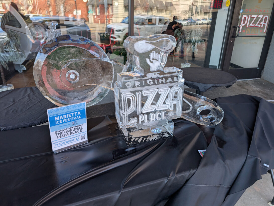 - Photo by Evan Bevins Tyson Whistler of Whistler Ice Works sculpted a giant pizza cutter to go with The Original Pizza Place’s logo for the annual Marietta Ice Festival. It was displayed Saturday in front of the Second Street restaurant.