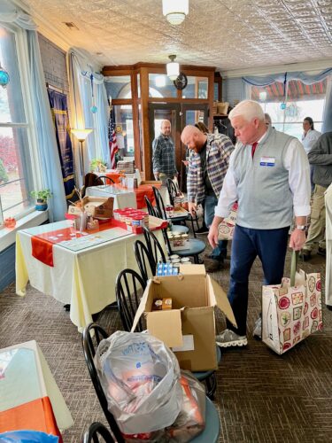 Members of the Marietta Morning Rotary helped assemble two dozen Thanksgiving meal baskets Friday morning at the Levee House as part of an annual partnership with the Marietta Salvation Army.